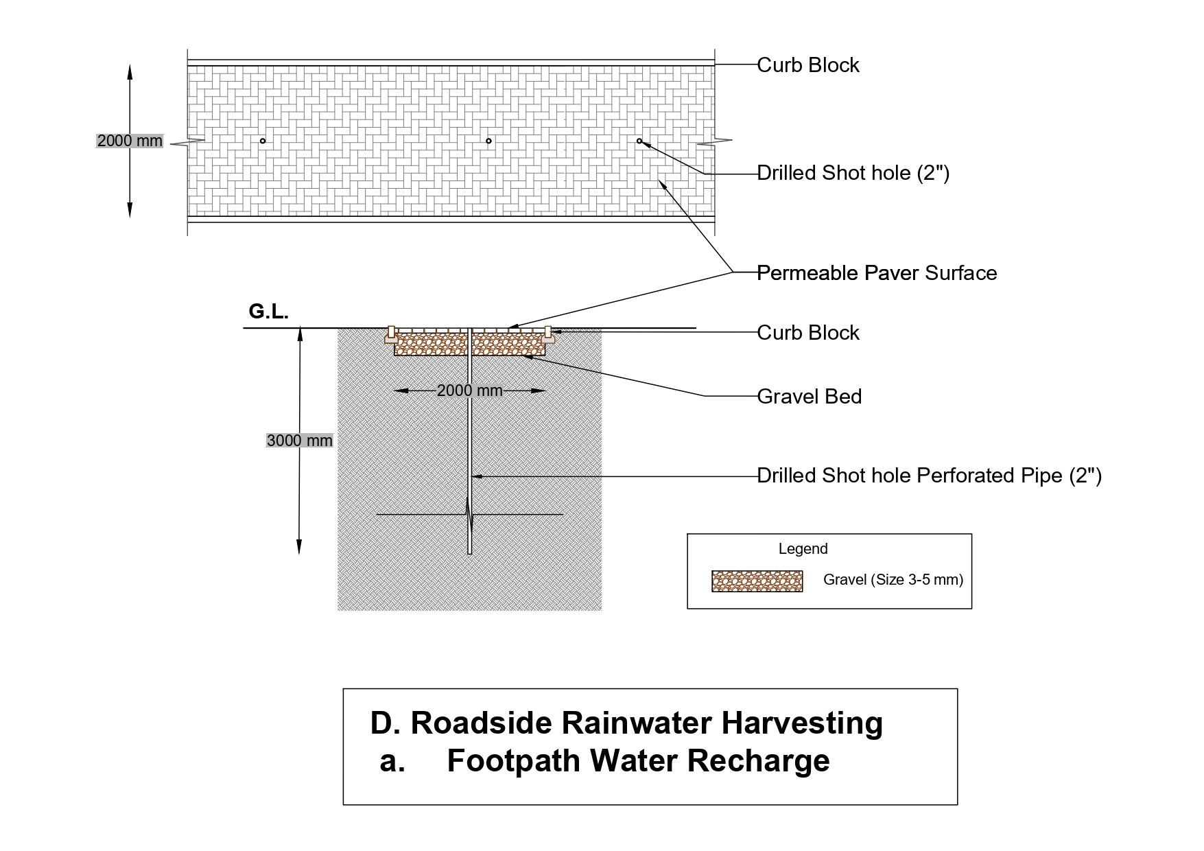 Replace the non-porous paver blocks by 100% porous paver blocks of the same size within 2 m x 2 m of area. Maintain the level of the porous block with the adjoining non-porous blocks. This will help to recharge around 2000 lits of rainwater from an average rainfall of 800 mm within monsoon months.