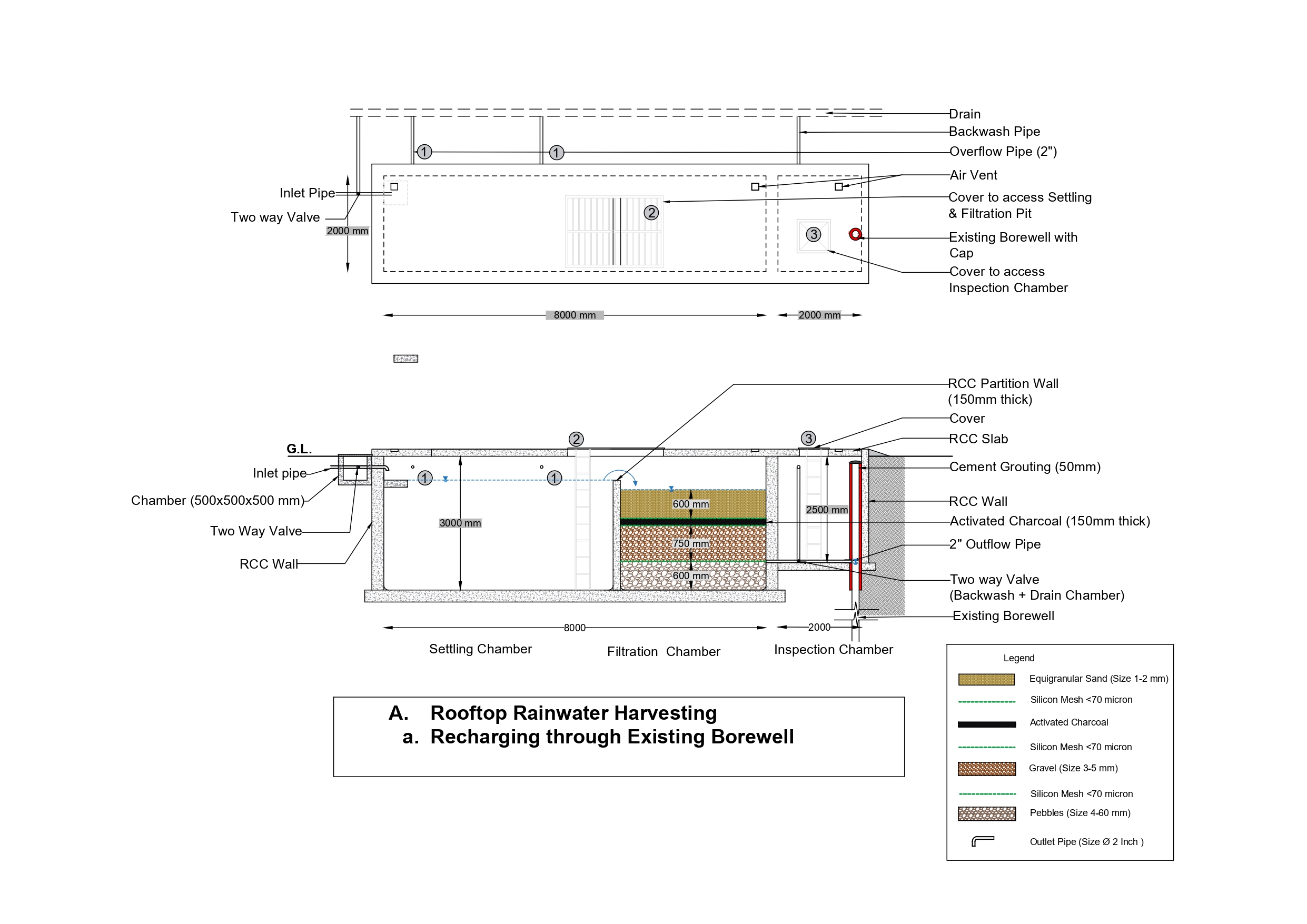 Using RCC slab, construct a tank of 8 m x 2 m x 3 m (L x W x D) size with two chambers, one for settling & the other for filtration of rooftop rainwater. In continuation with this, construct a third chamber (inspection) of 2 m x 2 m x 2.5 m size to accommodate the existing borewell. Hence, take due precautions so that the borewell is not damaged during the construction of the chamber. Please refer to the drawing for further detail.