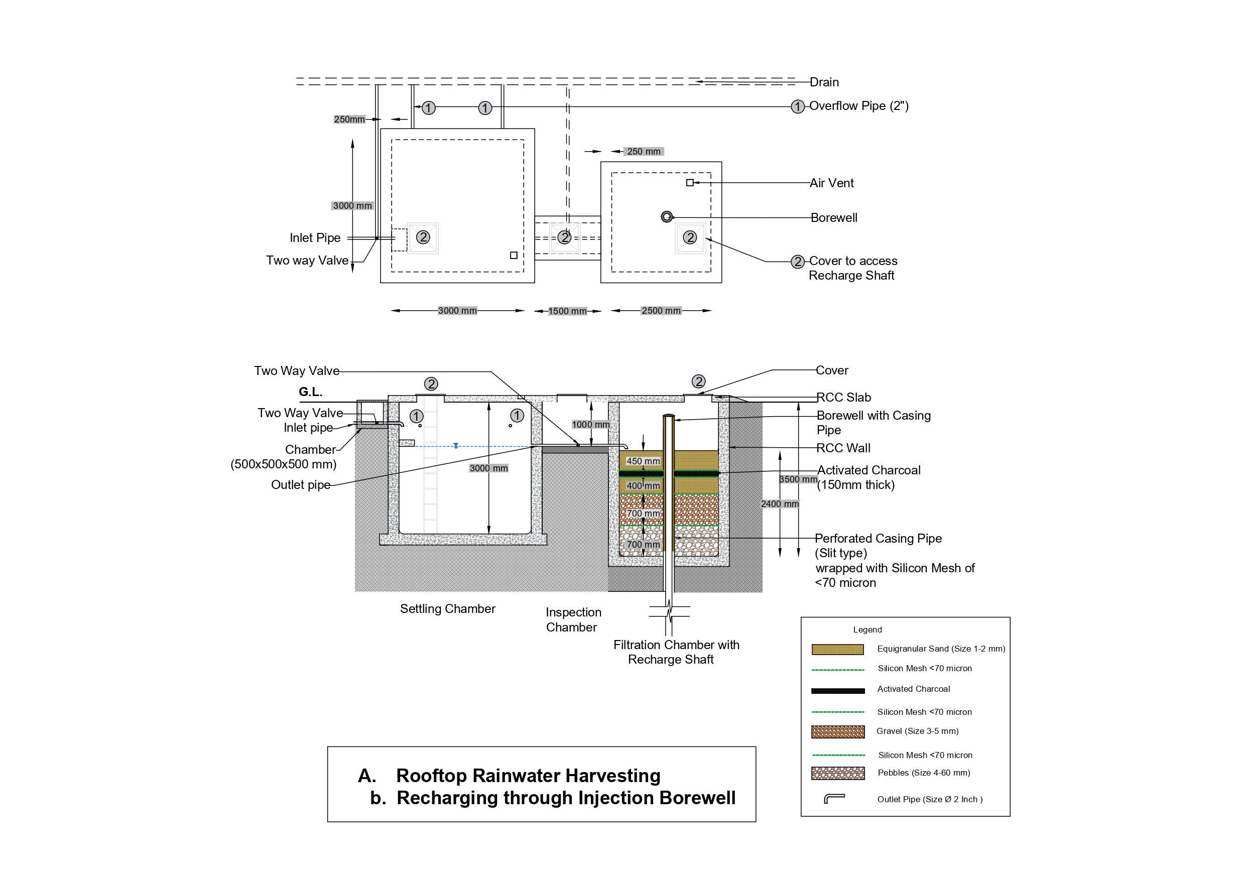 Using RCC slab, construct a settling tank of 3 m x 3 m x 3 m (L x W x D) size to collect the roof top rainwater. In continuation with this, construct a second small chamber (inspection) of 1.5 m x 1 m x 1 m size to lay down a horizontal pipe to carry the settled water from the settling chamber to the filter bed. In continuation with this inspection tank, construct a filtration tank of 2 m x 3 m x 3.5 m (L x W x D) size using RCC slab, to collect and filter the roof top rainwater. Please refer to the drawing for further detail.