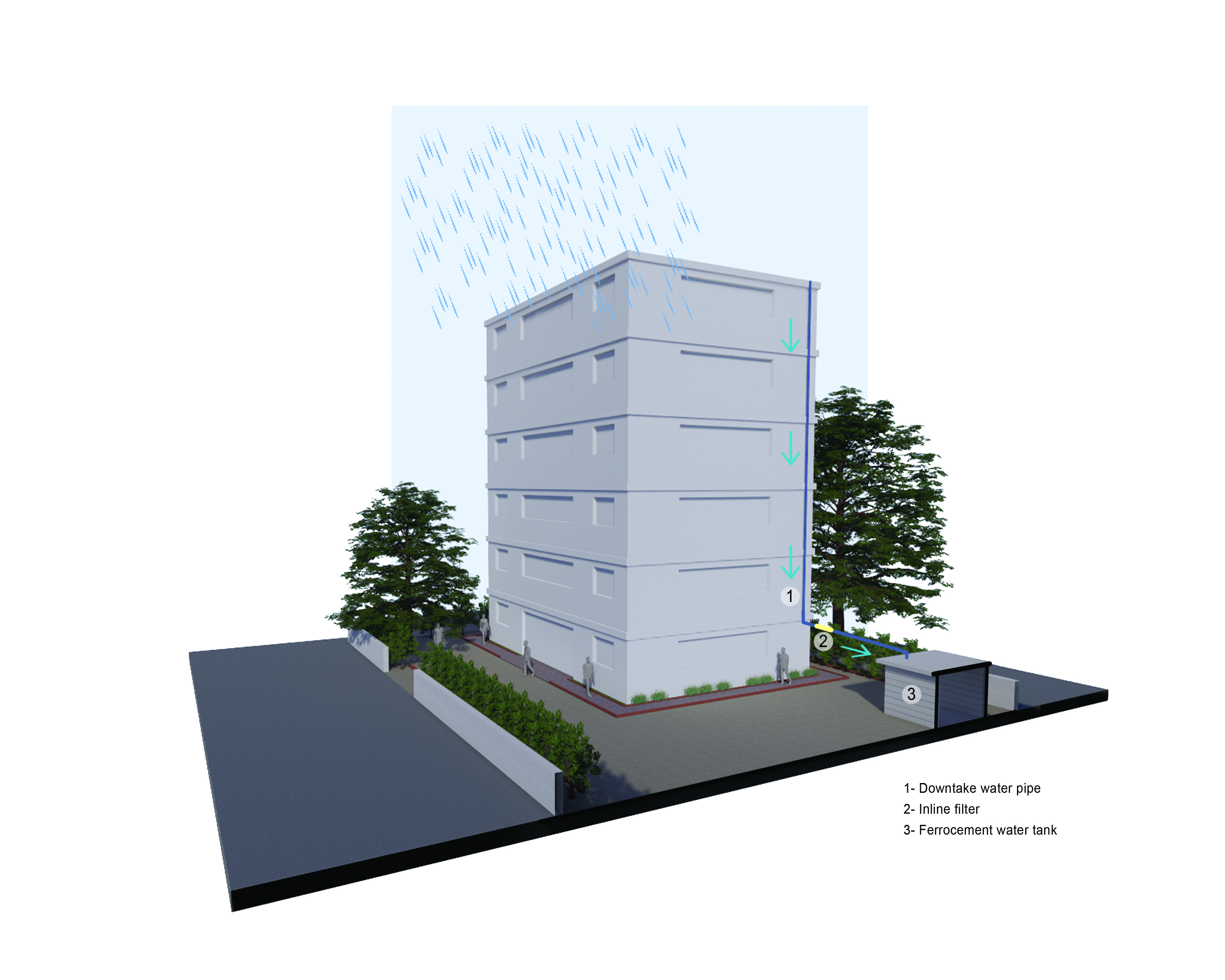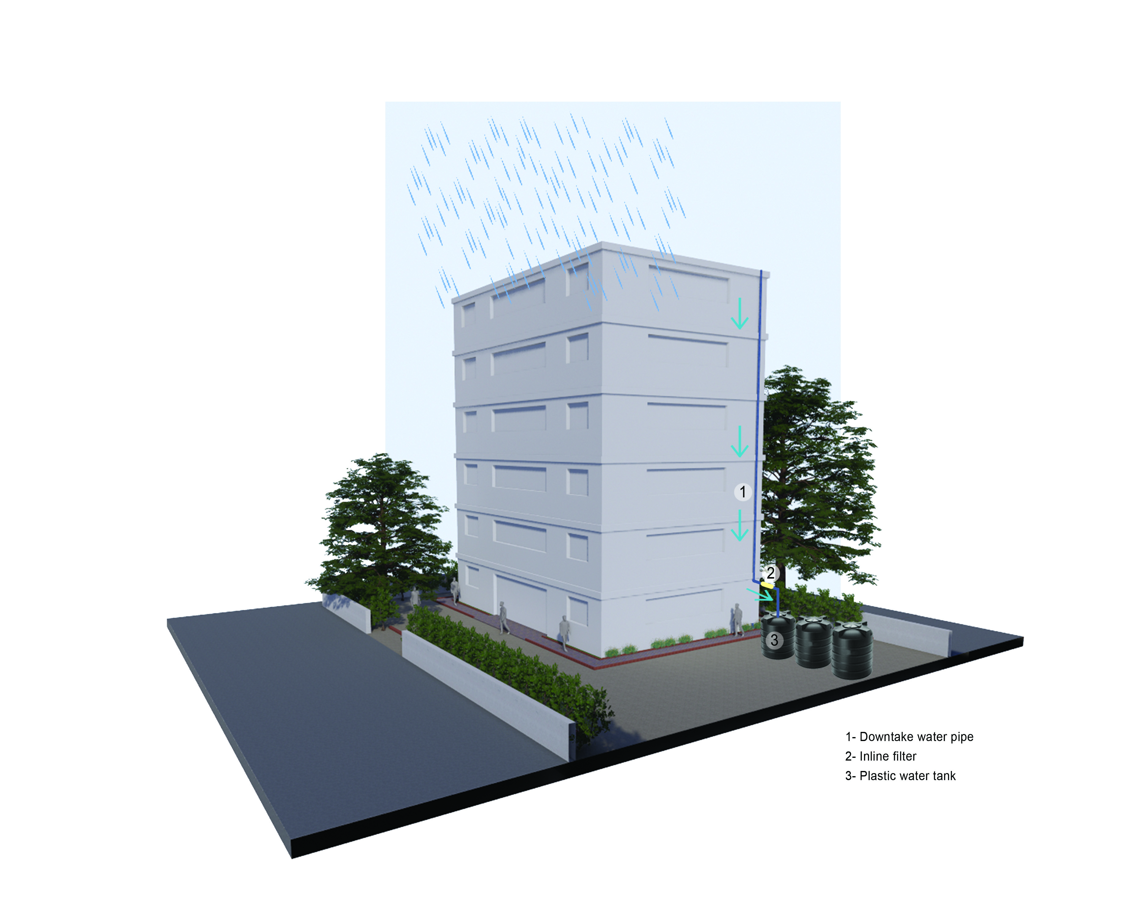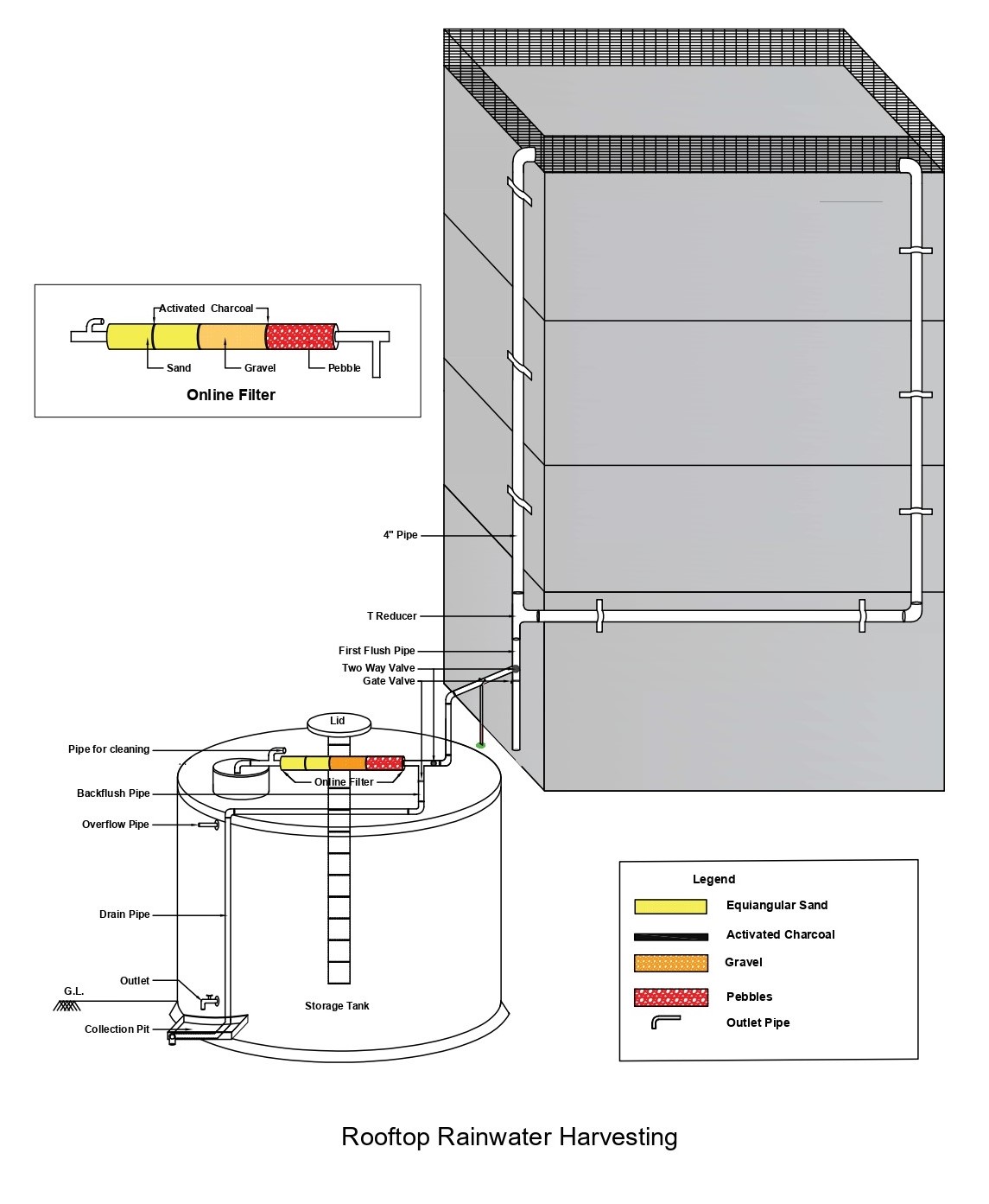Though the roof top rainwater appears to be clean it is necessary to use the online filters comprised of coarse sand, activated charcoal, coconut fibre, pebbles, and gravels. Such filters are readily available in the local market.