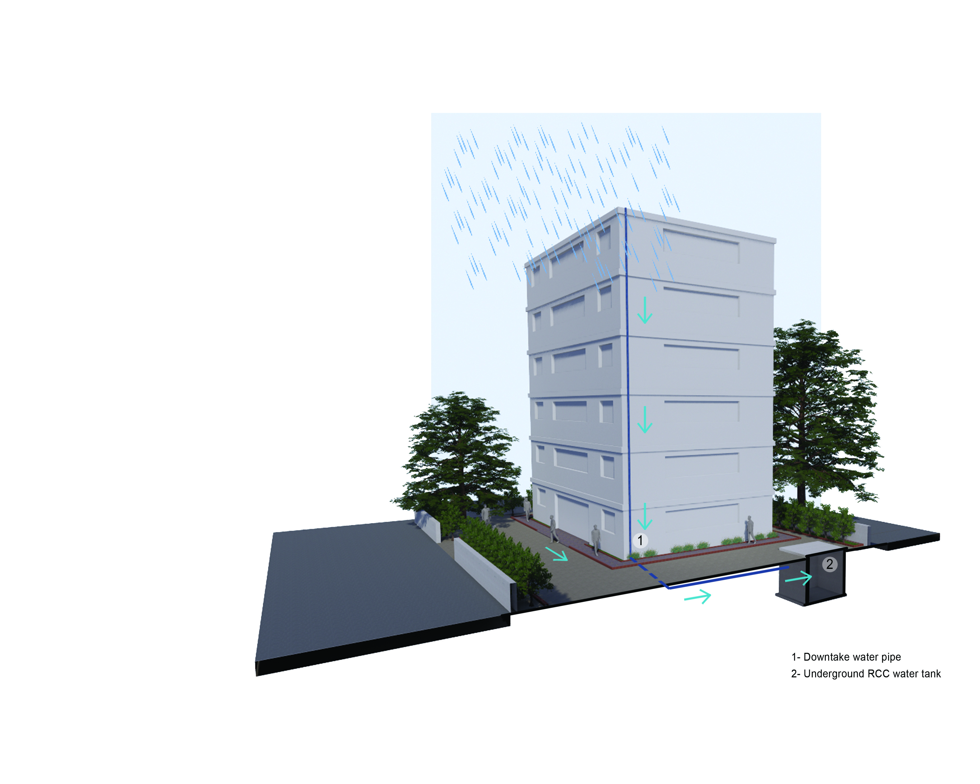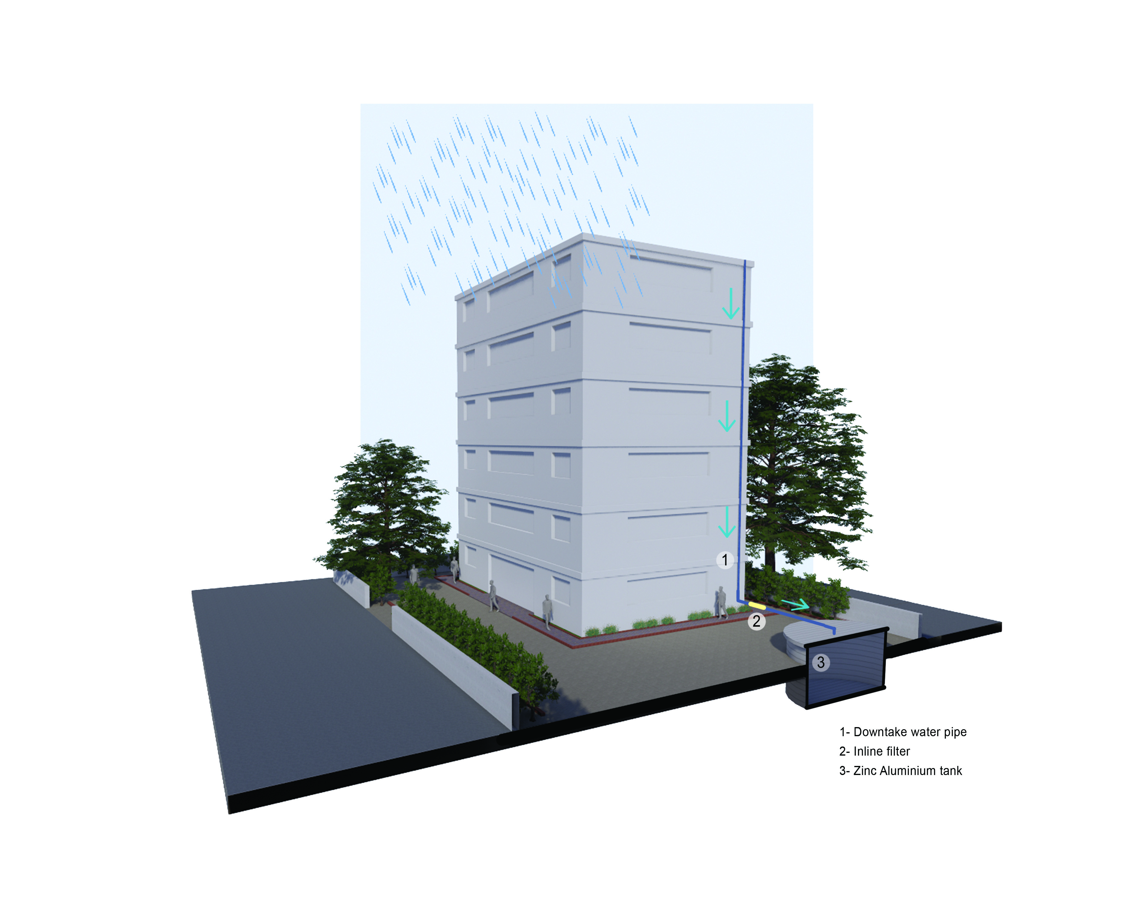 Channelize the rainwater collected on the roof of the building/s into one or two vertical drainpipes of at least 4” diameter PVC pipes. Bring this water through a single horizontal drainpipe of same diameter, laid down over a slab of the building or on the land surface depending upon the position of the storage tank. If slab support is not available, then lay down iron beams.