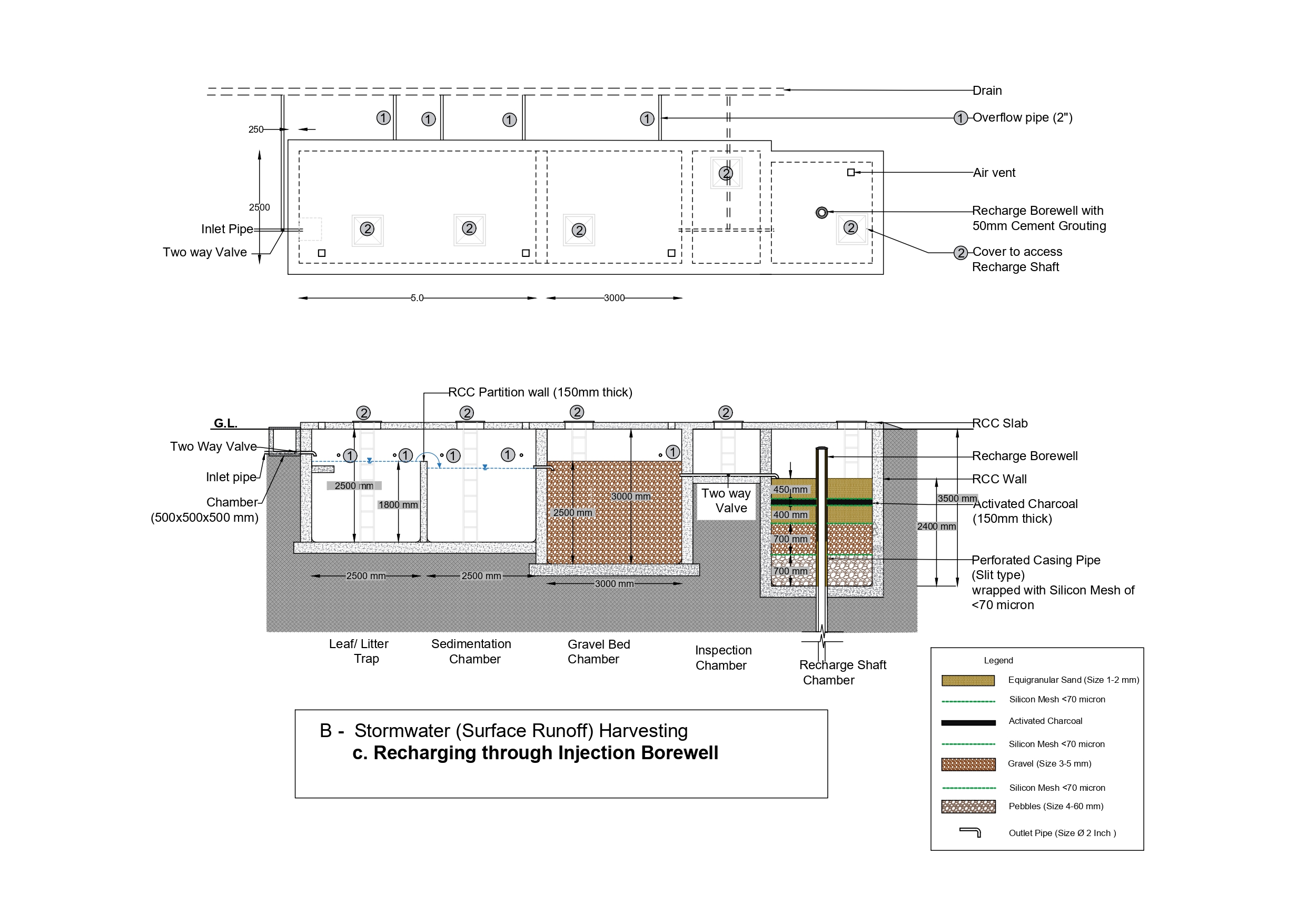 Every year Immediately after the monsoon take out the stagnant water present in the leaf/ litter trap, sedimentation and settling chambers. Also take out the silt/clay settled at the bottom of these chambers. For cleaning purposes use the manhole given in all the chambers.