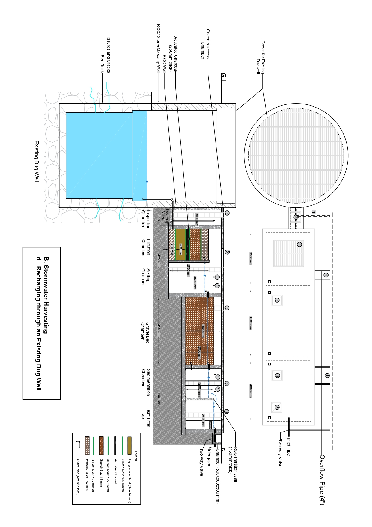 At last, make an inspection chamber of 2 m x 2.5 m x 3 m size to accommodate the existing borewell. Hence, take due precautions so that the borewell is not damaged during construction of the chamber. Please refer to the drawing for further detail.